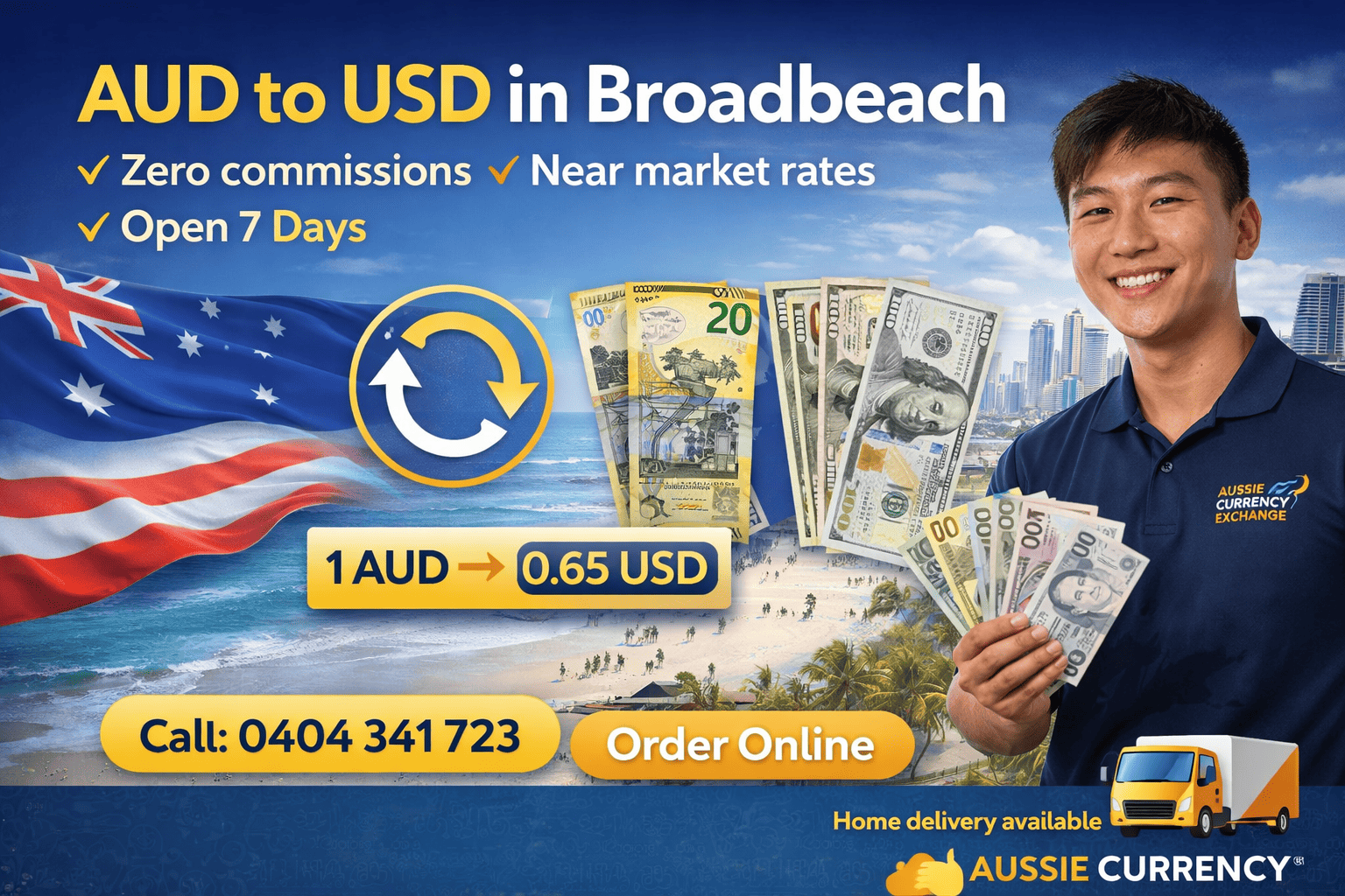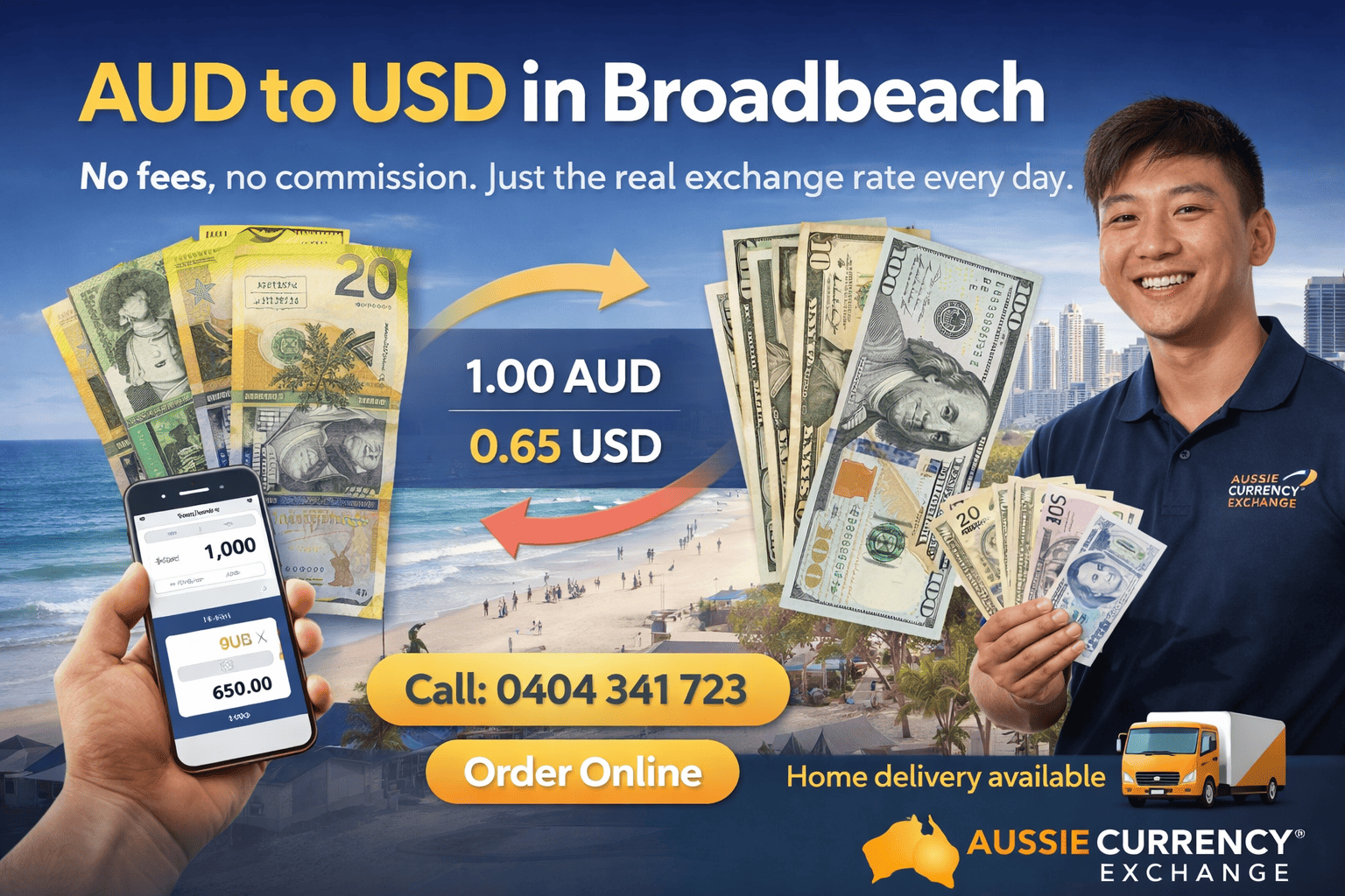 AUD to USD Broadbeach – Best Rates, Zero Commission